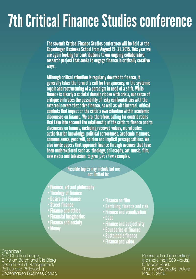 The seventh Critical Finance Studies conference will be held at the Copenhagen Business School from August 19–21, 2015. We are already now happy to announce that Prof. Dr. phil. Joseph Vogl, Humboldt-Univarsitat zu Berlin, has joined the conference as one of the keynote speakers. This year we are again looking for contributions to our ongoing collaborative research project that seeks to engage finance in critically creative ways.