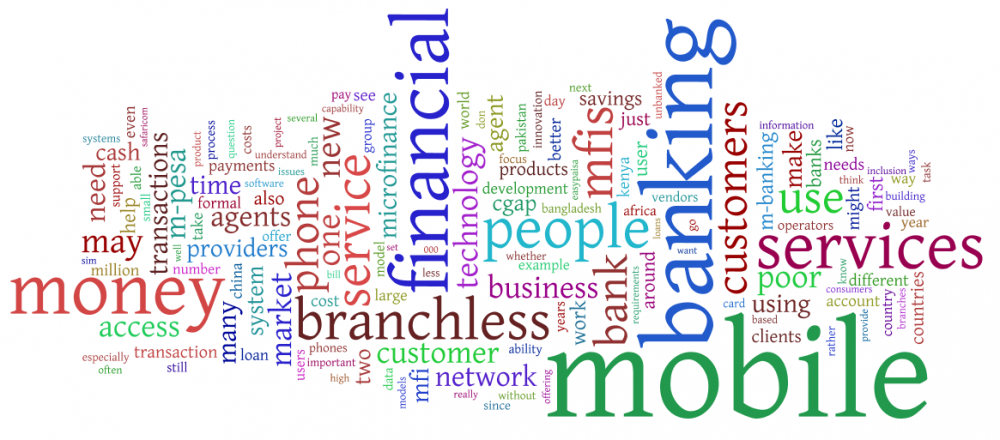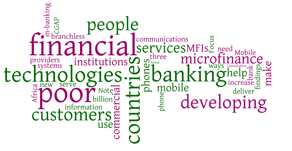These wordles from Many Eyes are a visualization of the word frequencies of all the terms in the Consultative Group to Assist the Poor (CGAP) Technology blog, in 2006 and 2010. CGAP is a consortium of government and philanthropic aid organizations, long interested in microfinance opportunities and poverty alleviation through financial inclusion. The wordles demonstrate the paradigm-shift in this community toward the use of the mobile phone as a financial channel, and a route to financial formalization: that is, toward alleviating poverty by formalizing poor people’s existing informal practices of money transfer, savings and storage.
