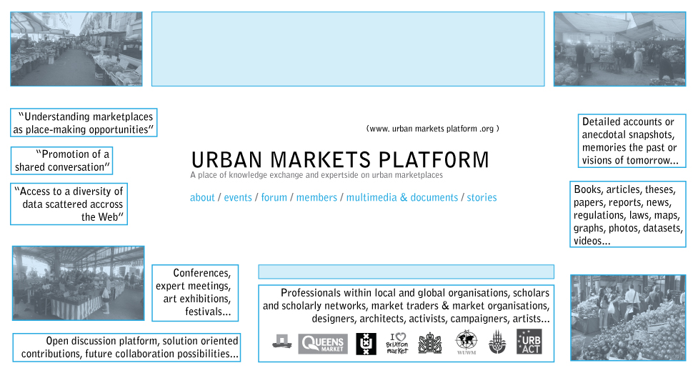 The aim of the Urban Market Platform is to facilitate a shared discussion and synergy that allows us to think about marketplaces as urban place-making opportunities. We invite participants to provide bottom-up perspectives of individual marketplaces, but also concrete design proposals or policy considerations. We do not aim to replace existing networks or platforms that work on related topics. Yet our belief is that the topic is so important, and provides so many opportunities, that a dedicated platform is justified and, indeed, needed.